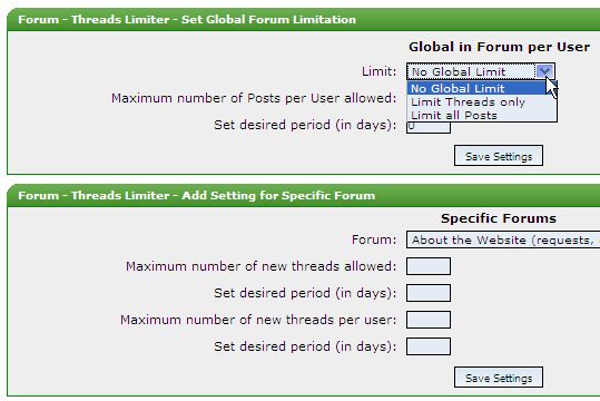In the whole forum there may be forums (like Off-topic, or Lounge) that are (ab)used too often and that muddle or obscure the on-topic forums. The Forum Threads Limiter will enable you to set a limit on the number of new threads created in a forum during a certain period (measured in multiples of 24 hours).